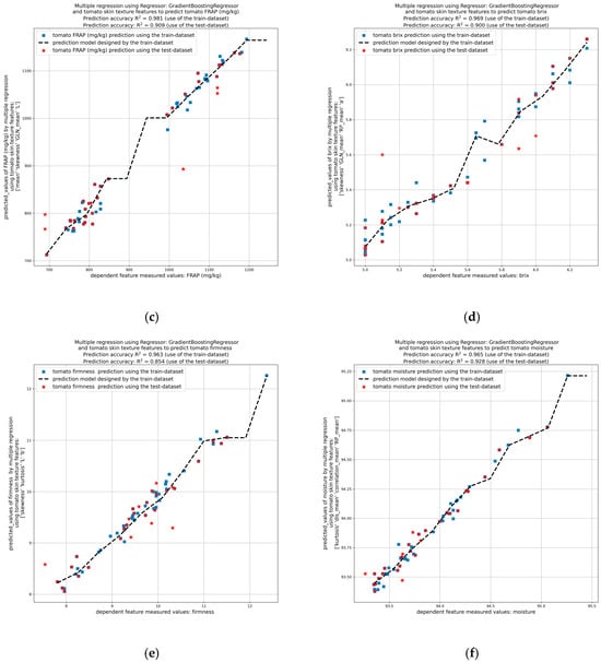 The results demonstrated that the standard deviation, energy, mean, a*, and b* values of the tomato peel have been found to be reliable indicators of the antiradical activity of the tomato flesh towards ABTS free radical (with a mean R2 > 0.952 and a test R2 > 0.798) (Figure 9a). Regarding TPC (Figure 9b) and antioxidant activity via FRAP assay (Figure 9c) of the tomato flesh, the indicators found were kurtosis, energy, mean, L*, and a*, plus mean, skewness, grey level non-uniformity (GLN), and L*, respectively, with prediction accuracy R2 higher than 0.9. Moreover, the skewness, GLN, mean, RP and a* values of the tomato peel have been shown to be effective indicators of the brix values of the tomato flesh (mean R2 > 0.969 and test R2 > 0.900) (Figure 9d), whereas the skewness, kurtosis, L* and b*, have been demonstrated to be significant indicators of firmness values (mean R2 > 0.963 and test R2 > 0.854) (Figure 9e). Finally, the kurtosis, standard deviation, mean, correlation, and RP values of the tomato peel have been shown to be effective indicators of the moisture content of the tomato flesh (mean R2 > 0.965 and test R2 > 0.928) (Figure 9f).