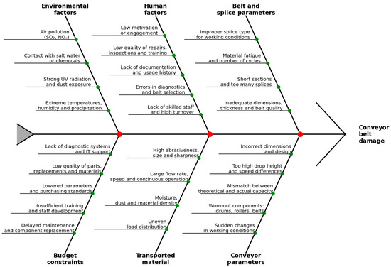 Another vital research area is identifying defect causes and systematizing them using quality-analysis tools such as the Ishikawa (fishbone) diagram [19,20]. This diagram organizes factors affecting belt damage into six main categories: (1) material characteristics; (2) belt construction; (3) operational parameters; (4) condition of discharge points; (5) maintenance and diagnostic quality; and (6) environmental factors. Causal analysis facilitates the identification of “bottlenecks” in operations and planning of corrective and preventive actions. To structure knowledge of potential degradation causes of steel-cord conveyor belts, Figure 1 presents an Ishikawa diagram.