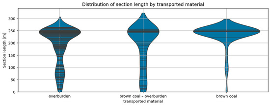 Data were collected from over 100 conveyor belt loops comprising various belt segments. A belt segment is defined as a continuous span between joints, supplied in a single spool (at Bełchatów Mine, segments may reach up to ~300 m). For each segment, the following were recorded: Material Type (lignite, overburden, or mix), Belt Age (in months), Resurs (% of expected operating time), Segment Length (m), Loop Length (m), number of core defects, defect density (defects per meter), defect area (m2), and defect area density (m2 per meter). Only segments that began their operation on the tested conveyor and had not undergone reconditioning were included: 274 segments (39 carrying lignite, 46 carrying mixed material, 189 carrying overburden). Figure 2 shows the length distribution by Material Type.