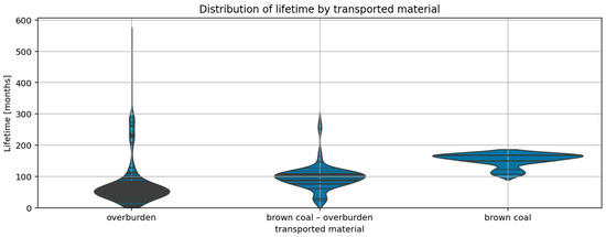 Violin plot of belt age distribution by transported material.
