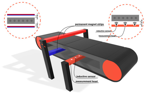 The DiagBelt+ system, developed at Wrocław University of Technology, uses inductive magnetic methods to magnetize steel cords and register magnetic-field disturbances caused by internal core discontinuities—cord breaks, wire fractures, corrosion, or at belt joints. The system was deployed at Bełchatów Lignite Mine under an NCBR project (PO-IR.01.01.01-00-1194/19-00) and is routinely used for conveyor belt scanning. Prior to its introduction, only visual inspections were conducted, which limited detection to large surface defects. DiagBelt+ enables continuous monitoring of belt core condition during operation, without stopping or dismantling the belt—a significant innovation. Magnetic diagnostics reveal the state of the steel cords hidden beneath the rubber cover. Figure 4 illustrates the installation scheme on the conveyor belt.