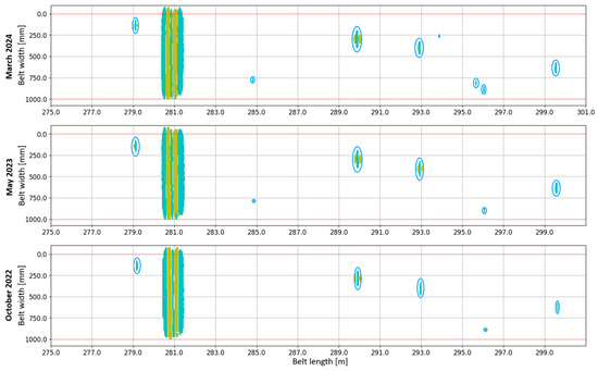 The belt core is magnetized by permanent-magnet bars, and a multi-channel inductive sensor array detects localized field disturbances indicating defects. The sensor head contains over 90 coils spaced 25 mm apart across the belt width. High spatial resolution (25 mm transversely and 2.5 mm longitudinally per 1 m/s belt speed, with 400 Hz sampling) allows detection of small defects—from single-cord cuts and wire fractures to advanced corrosion invisible from the outside. Signals from the coils are collected and processed by a dedicated data-collection unit and DiagBelt software (DiagBelt+ Data Analysis v. 1.0), synchronized to belt displacement (via a tachometer magnet on a pulley of known diameter). This enables localization of defects along the belt loop length and across its width. Detailed system operation is described in [29,30]. The system also automatically recognizes belt-joint signals (displaying distinct magnetic polarity), enabling identification and localization of all joints in the loop, and thus segmentation of belt sections. During a single scanning cycle, DiagBelt+ can scan the entire conveyor loop—several kilometers long and comprising multiple belt segments—without disrupting conveyor operation. For instance, at the lignite mine, a 2.25 m wide, 3–4 km long belt running at ~56 m/s can be fully scanned within minutes. The DiagBelt+ system acquires inductive magnetic signals at a sampling frequency of 400 Hz, resulting in a longitudinal resolution of approximately 2.5 mm per 1 m/s of belt speed. Since the inspected belts operate at a comparable speed of approximately 6 m/s, the effective sampling interval along the belt is 15 mm. The sensor head consists of 90 coils spaced every 25 mm across the belt width, which is either 1.8 m or 2.25 m. This yields 72 or 90 transverse sampling channels, respectively. For every meter of belt length, approximately 67 samples are recorded per channel. Consequently, a single full scan of a 2 km long belt generates approximately 12 million data points, structured as a matrix of 134,000 longitudinal rows (each covering 15 mm) and 90 columns (one per coil), used to map and quantify internal damage signals. The collected data form a 2D map of core defects along the belt length and width. Figure 5 shows an example of such imaging at three different time points.