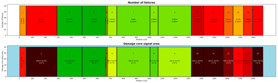 The software automatically divides the belt into sections (between joints), counts detected defects per section, and computes their total area. Quantitative belt-condition metrics—such as defect density (defects per length) and total defect area per meter—are derived. Results are displayed as color-coded maps and defect profiles, enabling quick identification of high-damage regions. Figure 6 provides an example of a color-coded condition map for a scanned belt loop. Individual belt segments are represented as rectangles, with lengths proportional to the actual segment lengths, and colors indicating the severity of internal damage.