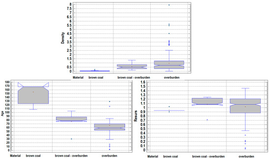 Box-and-whisker plot of Age, Resurs, and Failure Density for different materials: brown coal, brown coal–overburden, and overburden.