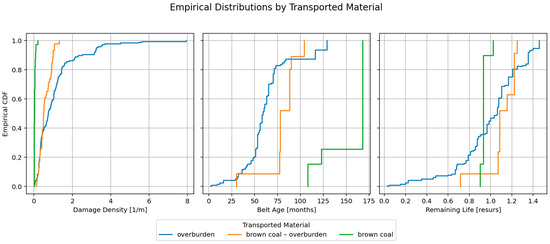 In addition to absolute belt age, a time-based indicator known as Resurs (percentage of expected operating time) was used to represent the relative level of belt usage. Resurs is defined as the ratio of the belt segment’s age (in months) to its expected service life, based on manufacturer specifications or operational experience from similar conveyor systems. Expressed as a percentage, it enables normalization of usage across belts of different lengths, installation dates, and operating conditions. While strongly correlated with age, Resurs provides a more contextualized view of expected wear, particularly useful in comparative studies of degradation rates. In the present study, Resurs was one of the independent variables used in statistical and regression analyses to assess its predictive potential for failure density and to compare the degradation behavior of belts transporting different materials. The operational configuration of the conveyor system (including bends, inclinations, and the number of transfer points) is not explicitly included in the model but may affect the degradation rate. However, such effects are partly captured through the Resurs indicator, which reflects cumulative operating time and changing load conditions. It is also worth noting that in open-pit operations, conveyor layouts are periodically modified, e.g., by adding or relocating transfer stations.