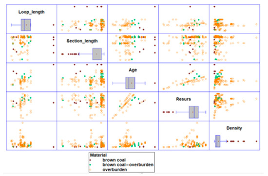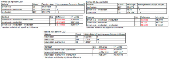 The means and medians for the three samples and three materials presented on the charts (Figure 7) are also included in numerical form in Table 1. There is also information about the standard deviation and coefficient of variation, as well as percentage differences between the brown coal and overburden from the data on their mixture. The smallest differences were for Resurs and the largest for brown coal and overburden.