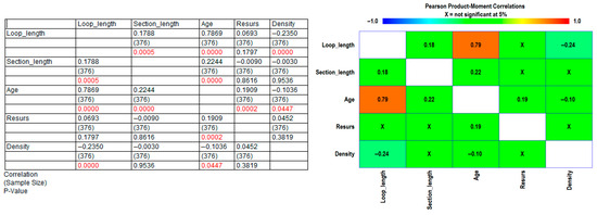 This chart (Figure 11) shows Pearson product–moment correlations between each pair of variables. These correlation coefficients range between −1 and +1 and measure the strength of the linear relationship between the variables. Also shown in parentheses is the number of pairs of data values used to compute each coefficient (274). The third number in each location of the table is a p-value that tests the statistical significance of the estimated correlations. p-values below 0.05 indicate statistically significant non-zero correlations at the 95.0% confidence level (in red). The following pairs of variables have p-values below 0.05: Loop Length and Section Length, Loop Length and Age, Loop Length and Density, Section Length and Age, Age and Resurs, Age and Density.