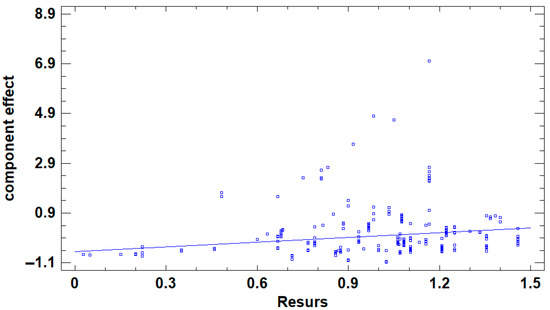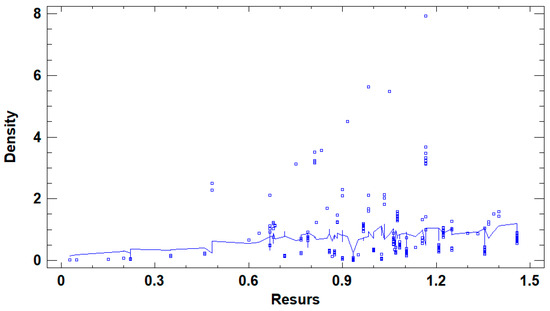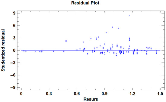A residual plot (Figure 12) illustrates Studentized residuals plotted against the Resurs value. A group of seven outliers (residuals ≥ 3) is visible, corresponding to segments with Resurs > 0.8, located on a loop of 1881 m, operating in an overburden transport system. These segments showed very high Damage Density values (up to 4–5), indicating severe wear beyond the limits for refurbishment.
