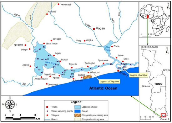 - Ouro-Sama, K.; Solitoke, H.D.; Tanouayi, G.; Lazar, I.M.; Bran, P.; Nadejde, M.; Ahoudi, H.; Badassan, T.E.-E.; Nyametso, A.Y.; Gnandi, K.; et al. Spatial and seasonal variation of trace elements contamination level of the waters from the hydrosystem Lake Togo-Lagoon of Aného (South of Togo). SN Appl. Sci. 2020, 2, 5. [Google Scholar] [CrossRef]