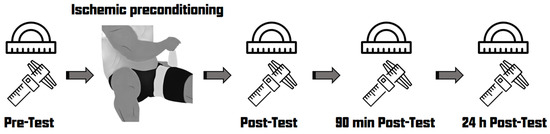 Participants underwent pre-testing followed by ischemic preconditioning. After the completion of ischemic preconditioning, participants underwent post-testing at three time points (immediately, 90 min, and 24 h after the completion of ischemic preconditioning) (Figure 1).