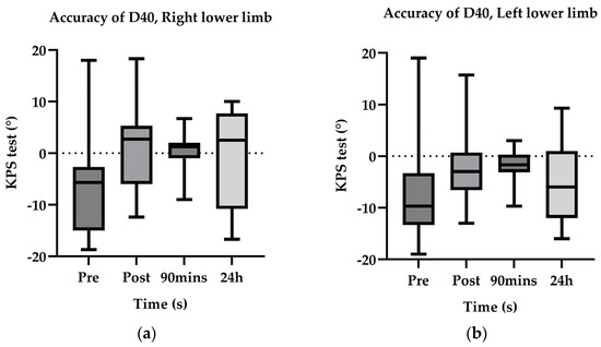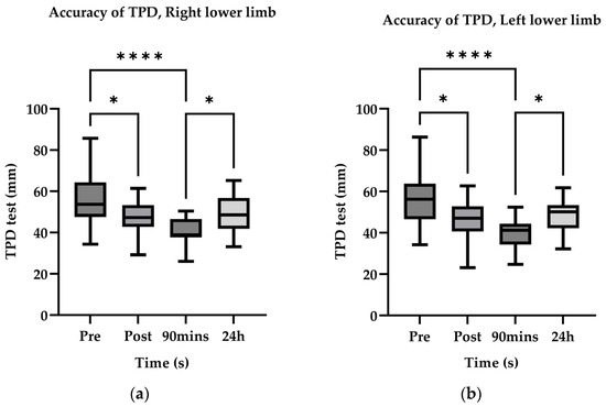 In pairwise comparisons of proprioceptive accuracy, significant differences were observed for TPDR between Pre and Post (p = 0.002), Pre and 90 min (p < 0.001), and Pre and 24 h (p = 0.002); Post and 90 min (p < 0.001) and Post and 24 h (p < 0.001); and 90 min and 24 h (p < 0.001). For TPDL, significant differences occurred between Pre and Post (p = 0.001), Pre and 90 min (p < 0.001), Pre and 24 h (p = 0.023); Post and 90 min (p = 0.004); and 90 min and 24 h (p < 0.001). For D40R, significant differences were found between Pre and Post (p = 0.002) and Pre and 90 min (p = 0.016). For D40L, a significant difference was detected between Pre and Post (p = 0.035) (Table 3).