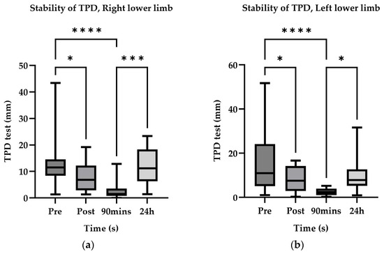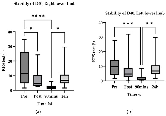 In pairwise comparisons of proprioceptive stability, significant differences were observed: For TPDR: between Pre and 90 min (p < 0.001), Post and 90 min (p = 0.010), and 90 min and 24 h (p < 0.001). For TPDL: between Pre and 90 min (p = 0.003), Post and 90 min (p = 0.002), and 90 min and 24 h (p = 0.003). For D40R: between Pre and 90 min (p < 0.001), Post and 90 min (p = 0.006), and 90 min and 24 h (p = 0.009). For D40L: between Pre and 90 min (p = 0.001) and 90 min and 24 h (p = 0.003) (Table 4).