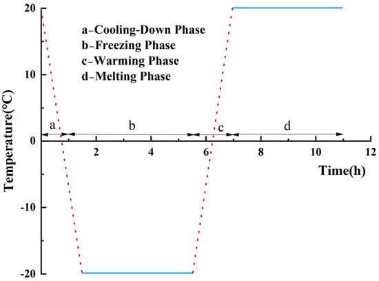 The rock is sandstone, taken from a mine. A crack is machined in the center of the entire rock sample. The crack runs through the sample, inclines 45°, is 2 mm long, and 0.2 mm wide. The rock samples were then divided into 5 groups, namely, freeze–thaw 0 times (i.e., without freeze–thaw treatment), 20 times, 40 times, 60 times, and 80 times groups, to simulate sandstones with different degrees of freezing in the natural environment. A freeze–thaw tester is used to freeze–thaw sandstone specimens. The specific operation of freeze–thaw is as follows: the sandstone specimens are frozen in the air, and after the freezing is completed, the specimens are immersed in water to warm up and melt slowly. The freezing temperature is set to −20 °C, and the melting temperature is set to 20 °C. There are 4 stages in a freeze–thaw cycle. In the first stage, the sandstone specimens were slowly cooled to −20 °C. In the second stage, the specimens were frozen at −20 °C for 4 h to ensure they were fully frozen. In the third stage, the water in the freeze–thaw tester tank was returned to the freeze–thaw box to submerge the sandstone specimens so that they were slowly warmed up to 20 °C. In the fourth stage, the temperature was kept at 20 °C for 4 h to allow the sandstone specimens to be fully thawed. The above process is a complete freeze–thaw cycle, repeated until the preset number of freeze–thaws is reached. The temperature change process is shown in Figure 1.