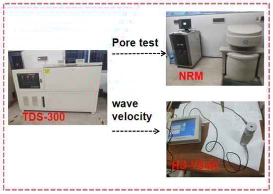 After the freeze–thaw cycle test, the sandstones were dried using a drying oven. Then, the mass of the sandstone specimens was measured using an electronic balance, and the sandstones’ wave velocity was measured using a wave velocity meter. The measuring instruments used are shown in Figure 3.