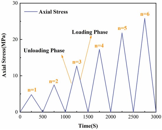Before the cyclic loading test starts, the first task is to clarify the cyclic loading methods. Through reading the references [21,22,23,24,25,26,27], we learned that there are various cyclic loading methods. The main methods are equal amplitude, graded, constant lower limit, variable lower limit cyclic loading and unloading, and so on. To simulate the change rule of the load on the roadbed during regular use, we adopted the constant lower limit cyclic loading and unloading method to study sandstone’s mechanical properties and damage mechanism. Figure 4 shows axial stress change with time during constant lower limit cyclic loading and unloading, where n indicates the cycle level.