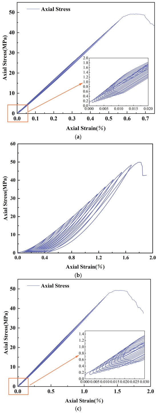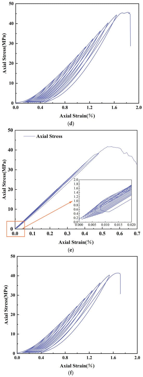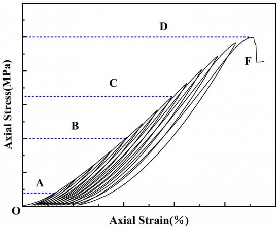 Previous studies have shown that the whole stress–strain curve of sandstone obtained by cyclic loading and unloading tests can be mainly divided into 5 stages (Figure 5). The 5 stages are as follows: Compacting Stage (OA), Elastic Deformation Stage (AB), Crack Stable Expansion Stage (BC), Crack Unstable Expansion Stage (CD), and Destruction Stage (DF). Crack extension and stress–strain curves behave differently at different stages.