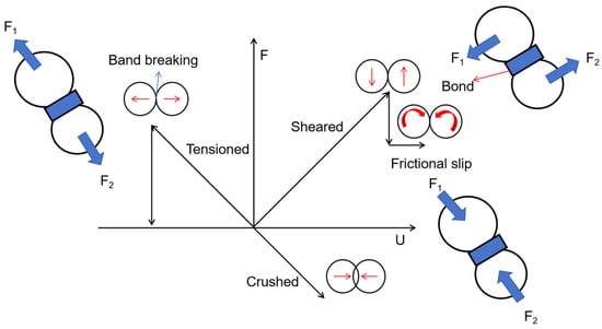PFC is a numerical simulation software based on the particle discrete element method. The particle discrete element method simplifies the complex mechanical behavior of reality to the mechanical representation of a large number of small particles. The linear parallel bond model is a mathematical method for describing the mechanical behavior between discrete particles. The core of the linear parallel bond model is the bond between the numerous particles. The bond transmits not only forces but also moments. As shown in Figure 6, two bonded particles may be subjected to a force in different directions in the linear parallel bond model (Linear Parallel Bond Model). These parameters mainly determine the bond’s strength: Pb_ten, Pb_coh, Emod, and Pb_fa. If this force exceeds the set bond strength, various types of ruptures occur in the bond between the particles. PFC can record this rupture and label it as different types of damage. A large number of small breaks eventually form macroscopic cracks.