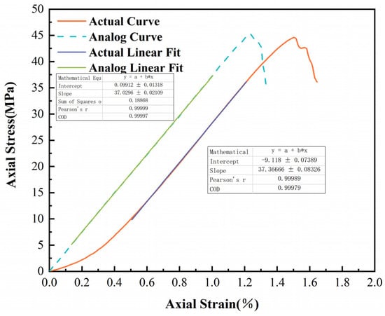 According to the experimental results, the trial-and-error method was used to select the model parameters. Subsequently, uniaxial compression simulation was carried out on the model. The stress–strain curve was made according to the simulation results and compared with the experimentally derived stress–strain curve (Figure 7).
