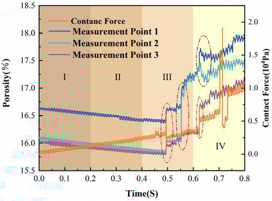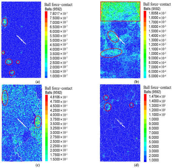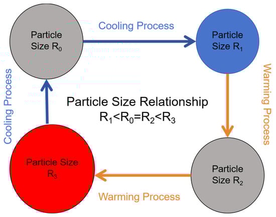 The PFC implements the model’s thermal calculation process under different conditions by assigning three parameter values (thermal resistance, linear expansion coefficient, and temperature). In a freeze–thaw cycle, the process of size change of particles can be represented by the following process [32]. The particle size decreases during cooling and increases during warming. The change in particle size leads to a change in the Contact Force and a weakening of the bond strength between the particles. The process can be seen in Figure 8.