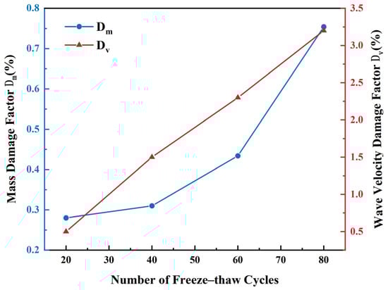 In conjunction with Figure 10, the sandstone wave velocity is more sensitive to changes in the freeze–thaw cycles, showing an overall near-linear increase. In contrast, the mass damage shows significant changes only at higher numbers of freeze–thaw cycles.