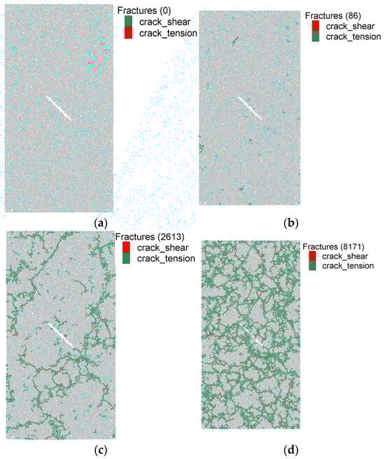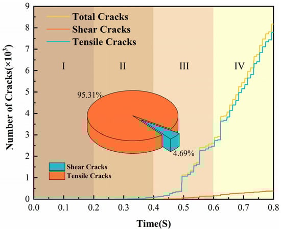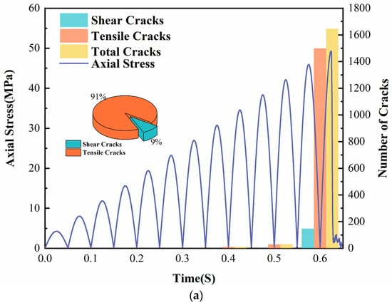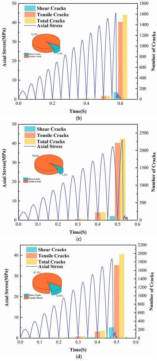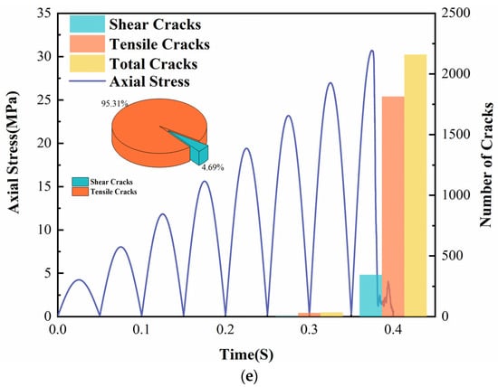 The built-in crack analysis function of PFC can help researchers conveniently analyze the expansion of cracks and the types of cracks. Figure 21 visualizes the dynamic changes of crack numbers and the generation of different types of cracks throughout the simulation process. Figure 22 shows the changes in the acoustic emission (AE) parameters. The two sets of pictures visualize the crack evolution of sandstone under cyclic loading conditions.
