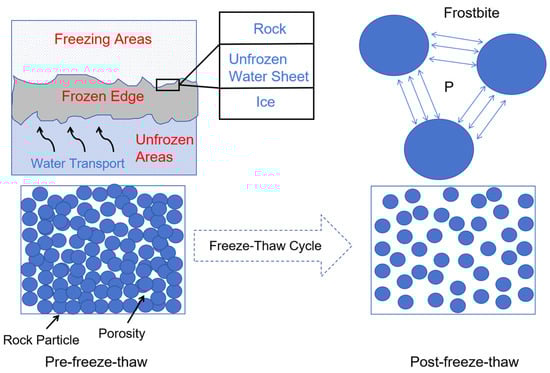 The crack distribution images show that tension cracks dominate the crack types in the early freeze–thaw stage. This phenomenon coincides with the conclusion of the Second Theory of Freeze–thaw Force [33]. The Second Theory of Freeze–thaw Force suggests that when a water particle freezes, there is a region with low water content and low moisture conductivity at the bottom of the particle. This region is called the frozen edge (Figure 12). Moisture migrates from the unfrozen region through the frozen edge to the freezing zone under the action of temperature gradients, gravitational potential energy, pressure potential energy, matrix potential energy, and other generalized traction forces. As moisture continues to migrate and accumulate in the freezing zone, the moisture inside the sandstone specimens gradually freezes into ice, forming freeze–thaw force. Under freeze–thaw forces, sandstone particles squeeze each other, making the pore space between the particles larger. More critically, the repeated phase transitions between water and ice are like cyclic loading and unloading on sandstone particles. These are subjected to cyclic loading and unloading and undergo cementation damage to form tiny cracks. Moreover, due to the characteristics of the rock’s high compressive capacity and weak tensile capacity, the microcracks formed by the freeze–thaw process are mostly tension cracks.