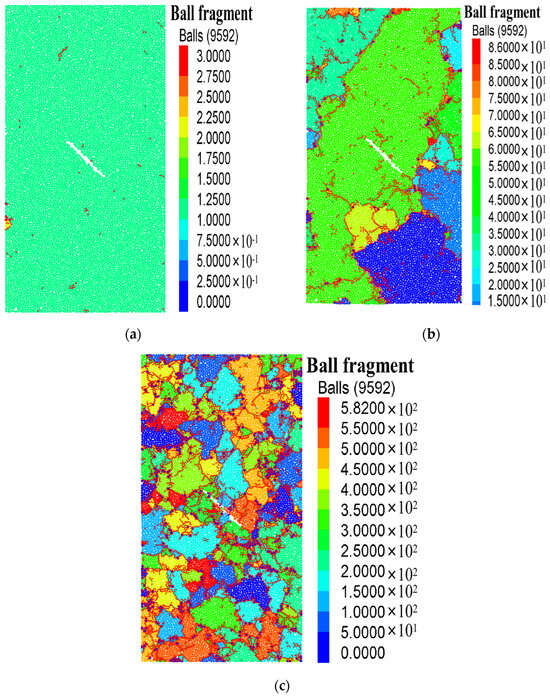 The particle numbers meet the requirements of numerical calculations, the RA = 2.0 (the recommended value is above 1.25) was calculated by substituting the specific values. The prefabricated crack was generated after the particles were cemented, and the linear parallel bond model (Linear Parallel Bond Model) was selected for the cementation model. Some scholars [29] have shown that this bond model can very well simulate the properties of the rock.