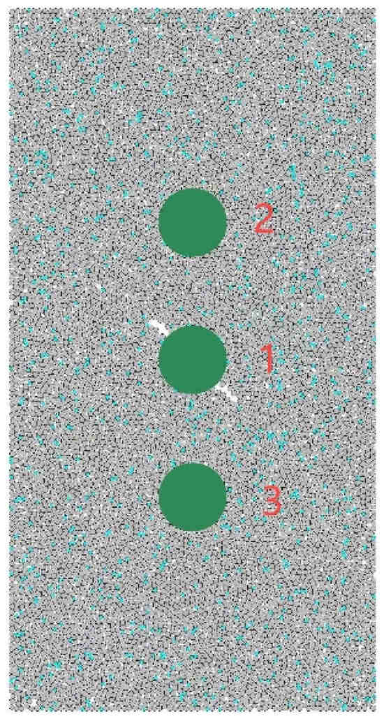 The model generated by PFC software does not have a compaction phase during uniaxial compression. In contrast, sandstone in its natural state has a complex composition, and its interior has certain pore spaces, joints, and other defects. Sandstone cannot be regarded as a purely ideal elastic body, and its stress–strain curve has a compacting phase. Therefore, the simulated curves do not precisely overlap with the measured curves [30]. Parameter calibration aims to confirm whether the uniaxial compressive strength and modulus of elasticity are consistent. From the fitting results of the two curves, the effect of parameter calibration meets the basic requirements of numerical simulation. The specific parameters of the numerical simulation are shown in Table 2. In Table 2, Pb_fa refers to the angle of internal friction of the rock. Emod refers to the modulus of elasticity of the rock. Fric is the coefficient of friction between the particles. Pb_ten refers to the tensile strength of the rock. Pb_coh refers to the cohesive force of the rock.