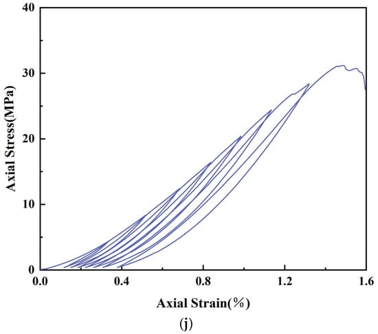 Comparison of stress–strain curves with different freeze–thaw times. (a) 0 freeze–thaw (simulation), (b) 0 freeze–thaw (measurement), (c) 20 freeze–thaw (simulation), (d) 20 freeze–thaw (measurement), (e) 40 freeze–thaw (simulation), (f) 40 freeze–thaw (measurement), (g) 60 freeze–thaw (simulation), (h) 60 freeze–thaw (measurement), (i) 80 freeze–thaw (simulation), (j) 80 freeze–thaw (measurement).