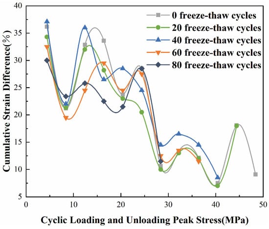 The results obtained from the calculations in Table 5 are plotted in Figure 19. The variation of the Cumulative Strain Difference for different numbers of freeze–thaw cycles is also shown in Figure 19.