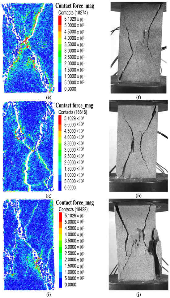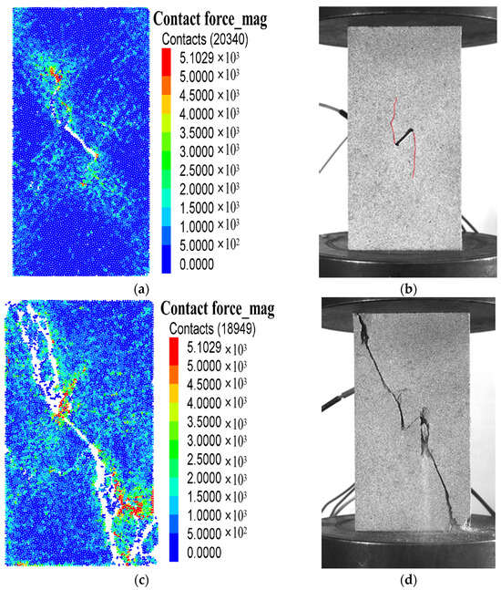 Figure 20 visualizes the damage characteristics of sandstone after cyclic loading and unloading applied under different freeze–thaw cycles. The following features can be observed by comparing the measured damage images with the simulation results. For the sandstone without freeze–thaw, the damage cracks are generated at the ends of the prefabricated crack. Then, it gradually extended to the top and bottom ends of the specimen. During this process, the region with the most considerable deformation appears near the prefabricated crack. The overall deformation of the sandstone specimens freeze–thawed 20 cycles was close to that of the specimens without freeze–thaw, and the expansion patterns of the cracks were macroscopically similar. The difference is that after 20 freeze–thaw times, the sandstone formed a crack through the specimen’s top left and bottom right surfaces. The inclination of this crack remained the same as that of the prefabricated crack.