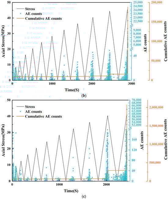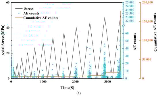 As can be seen from Figure 21 and Figure 22, the emergence of cracks shows a significant correlation with the magnitude of axial stress. When the axial stress exceeds a specific value, cracks appear in large numbers. The energy accumulation within the sandstone reaches a certain degree and is more likely to be released in large quantities at the later stage of cyclic loading. Hence, cracks tend to appear in the last 2~3 stress cycle levels.