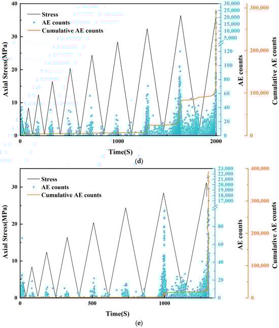 Variation of acoustic emission parameters during loading and unloading of specimens with different numbers of freeze–thaw cycles. (a) 0 times, (b) 20 times, (c) 40 times, (d) 60 times. (e) 80 times.