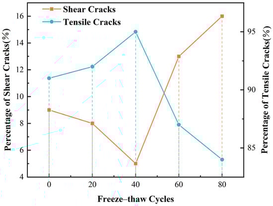 The number of tensile cracks dominated throughout the cyclic loading process. The proportion of shear cracks showed an increasing trend with the increment of freeze–thaw cycles (Figure 23). It can be attributed to the formation of shear rupture zones in the sandstone damage process. The shear rupture zone is a high-incidence zone for shear cracks. Thus, shear cracks briefly dominate at a given stage of rock damage. In addition, after the 50th freeze–thaw cycle, the growth rate of tension cracks decreased, and the growth rate of shear cracks increased. This further indicates that the higher the freeze–thaw cycles, the more prone the sandstone is to shear damage.