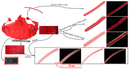 Figure 2. In this case, the examined material was a scarf, for which the following components were identified: tassels, fabric, edge thread, and embroidery. The fibers composing these elements were determined to be viscose, polyester, and lyocell fibers.