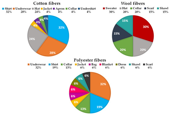 Graphical representation of cotton, wool, and polyester fibers in the analyzed garments. One garment represents approximately 4% in the first graph, 5% in the second graph, and 6% in the third graph.