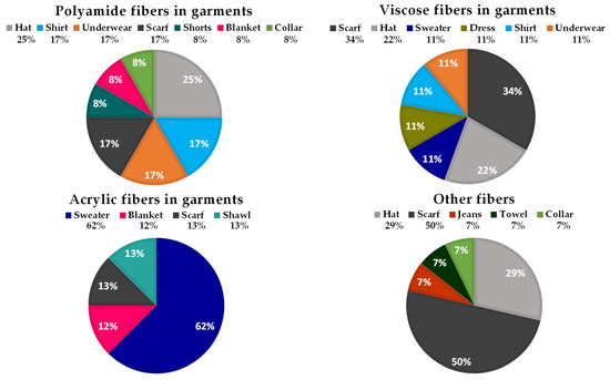 Graphical representation of polyamide, viscose, acrylic, and other fibers (including regenerated cellulose, silk, and elastane) in the analyzed garments. One garment represents approximately 8% in the first graph, 11% in the second graph, 12% in the third graph, and 7% in the fourth graph.