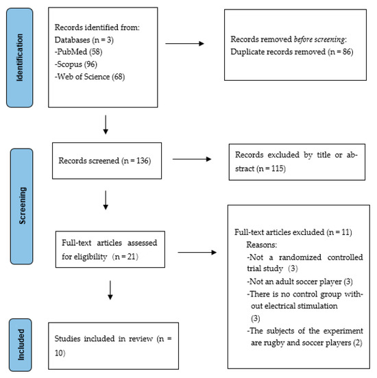 A total of 222 studies were identified through the PubMed, Scopus, and Web of Science databases. The review included 10 studies after removing 86 studies as duplicates; 115 for not meeting the eligibility criteria after reviewing the titles and abstracts; 3 for including participants who were not adult athletes; 3 for not being RCTs; 3 for lacking a control group without electrical stimulation; and 2 for involving both rugby and soccer players. The flow diagram illustrates the selection process (Figure 1).