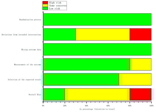 Table 3 and Figure 2 present the quality assessment. Most of the included studies exhibited a low risk of bias in both the randomization process and the missing outcome data domains. However, only three studies were rated as having a low risk of bias in the domain of deviations from intended interventions [15,21,23]. A total of two studies [15,20] demonstrated some concerns in the domain of outcome measurement, whereas three studies [15,16,17] exhibited some concerns in the domain of reported result selection. Overall, among the 10 included studies, 2 were rated as having a low risk of bias [21,23], 6 as having some concerns [14,15,17,18,20,22], and 2 as having a high risk of bias [16,19].