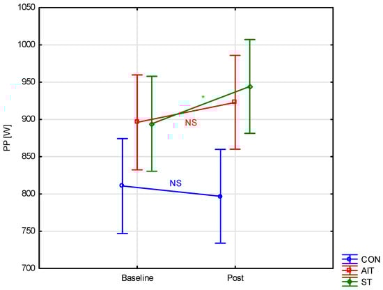 Effect of strength training on peak power (PP) (*: p < 0.05; NS: non-significant; CON: control group; ST: strength training; AIT: aerobic interval training; vertical bars indicate a 0.95 confidence interval).