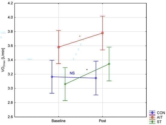 Effect of strength training on absolute maximal oxygen uptake (VO2max) (*: p < 0.05; NS: non-significant; CON: control group; ST: strength training; AIT: aerobic interval training; vertical bars indicate a 0.95 confidence interval).