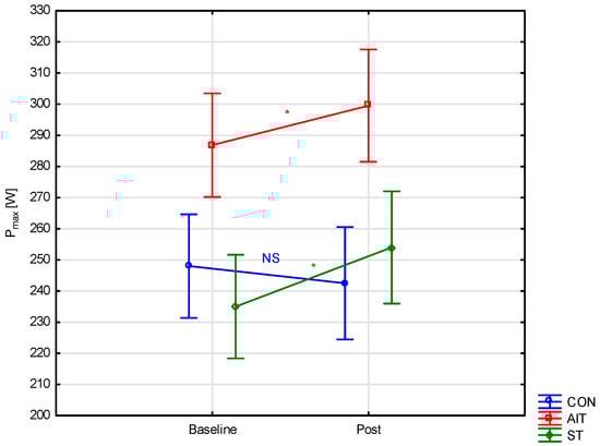 Effect of strength training on maximal power output (Pmax) (*: p < 0.005; NS: non-significant; CON: control group; ST: strength training; AIT: aerobic interval training; vertical bars indicate a 0.95 confidence interval).