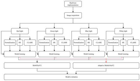 The original MobileNetV2 model was evaluated under all four lighting conditions using three pre-processing methods: raw images (no pre-processing), CLAHE, and HE. Under red lighting, both CLAHE and HE yielded the highest scores, reaching 99.80% in accuracy, precision, recall, and F1-score. For green lighting, HE performed best, achieving 98.22% in both accuracy and F1-score, while the other methods showed lower performance. Under blue lighting, the model performed best with raw images, achieving 99.55% across all evaluation metrics. Similarly, under white lighting, raw images again delivered the best performance, with 98.34% accuracy, whereas CLAHE resulted in the lowest performance.