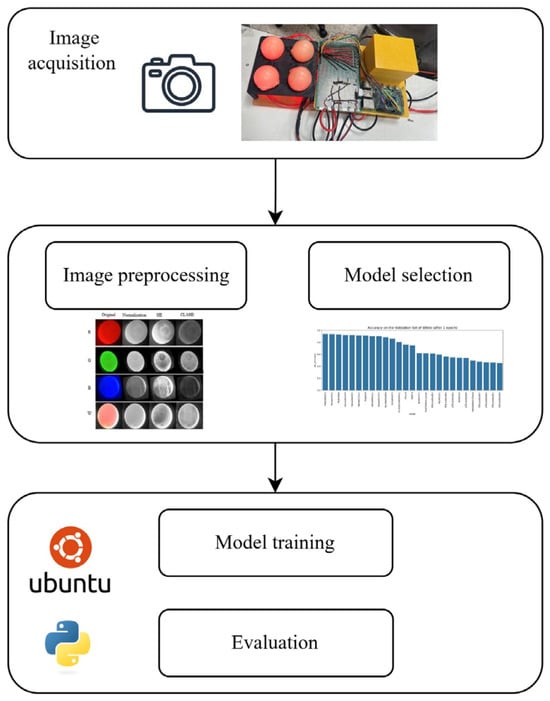 The experimental workflow began with the development of a hardware system for dataset acquisition. Next, image processing techniques were applied to reduce noise and enhance image quality before training the model. We then proceeded with model selection to identify the most suitable CNN architecture for the duck egg dataset. After selecting the best-performing model, adaptive techniques were applied to further optimize its performance. Finally, we evaluated the results to assess the system’s effectiveness. Figure 1 shows the experimental workflow.