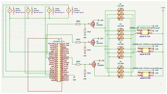 Figure 4 presents the circuit diagram used to control the LED colors via a Raspberry Pi and AO3400A MOSFETs. The LED color can be changed by pressing a tactile switch. The AO3400A MOSFET was chosen for its compatibility with the low-voltage GPIO signals of the Raspberry Pi, making it ideal for switching operations and low-voltage power control.