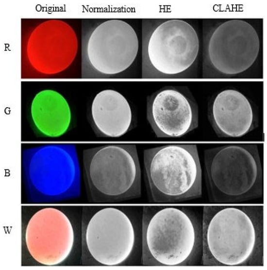 The dataset used in this research was collected in collaboration with Consolutech Company (Bangkok, Thailand) from a real duck egg processing plant environment. A total of 23,904 images were acquired under four different lighting conditions: red, green, blue, and white. Each lighting condition included 1494 images, consisting of 750 cracked eggs and 744 control (non-cracked) eggs. The images were further processed using image enhancement techniques. For each condition, the dataset was divided into 836 images for training, 209 images for validation, and 449 images for testing. Then, the images went through a series of image processing steps. First, the original images were normalized. Next, histogram equalization (HE) was applied to enhance contrast. Finally, contrast limited adaptive histogram equalization (CLAHE) was used for further enhancement. To increase the dataset size and improve model robustness, data augmentation techniques, such as rotation, zoom in, and zoom out, were applied. Examples of the processed images are shown in Figure 5.