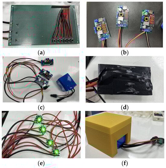 Hardware. (a) PCB with switch, (b) step-down module, (c) step-down module with battery, (d) protection of the step-down switching regulator with insulating tape, (e) LED operation check, (f) battery in the case.