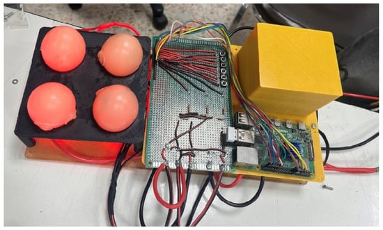 We implemented a portable egg crack detection system by simulating environmental lighting and conditions similar to those found in a duck egg processing plant. The control system, built on a Raspberry Pi, manages four distinct lighting channels and is powered by a custom-designed backup battery. An integrated electrical circuit was developed to combine all components onto a universal PCB. Additionally, the egg tray was 3D printed using filament material and designed to match the dimensions of standard industry-grade trays. Figure 2 shows the overall system diagram.