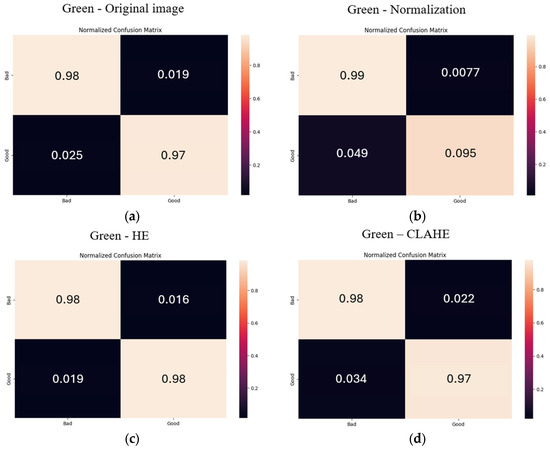 Confusion matrix of MobileNetV2 under green light. (a) Original image, (b) normalization, (c) HE, and (d) CLAHE.