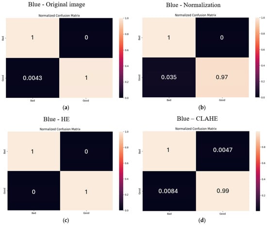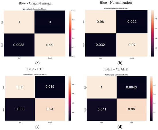 Confusion matrix of MobileNetV2 under blue light. (a) Original image, (b) normalization, (c) HE, and (d) CLAHE.